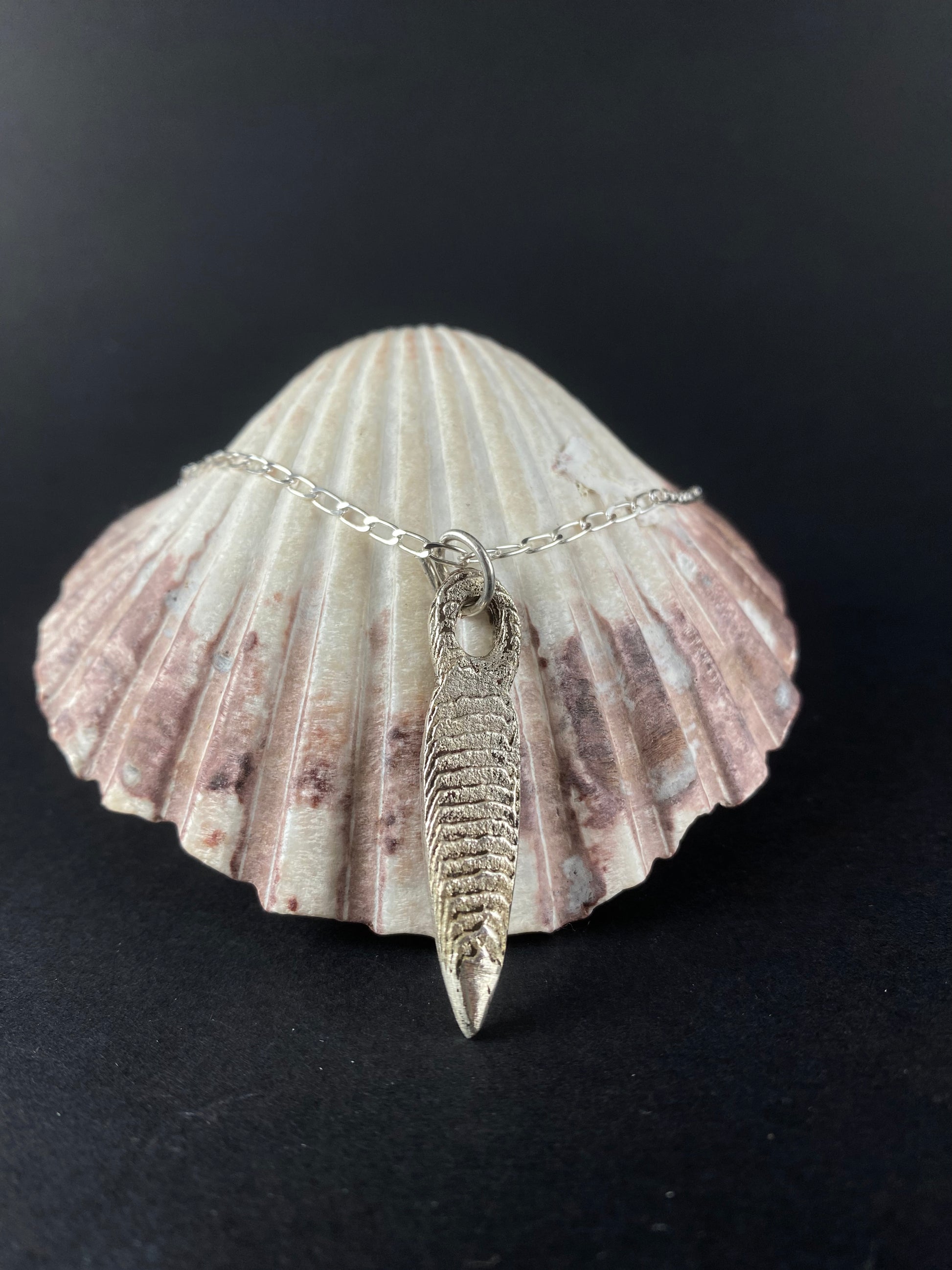 A sterling silver necklace charm, cast using cuttlefish bone. As all pieces are cast in cuttlefish, the natural pattern of the cuttlefish will lead to unique variations between pieces, meaning the earrings you receive will not have the identical pattern to the displayed image.