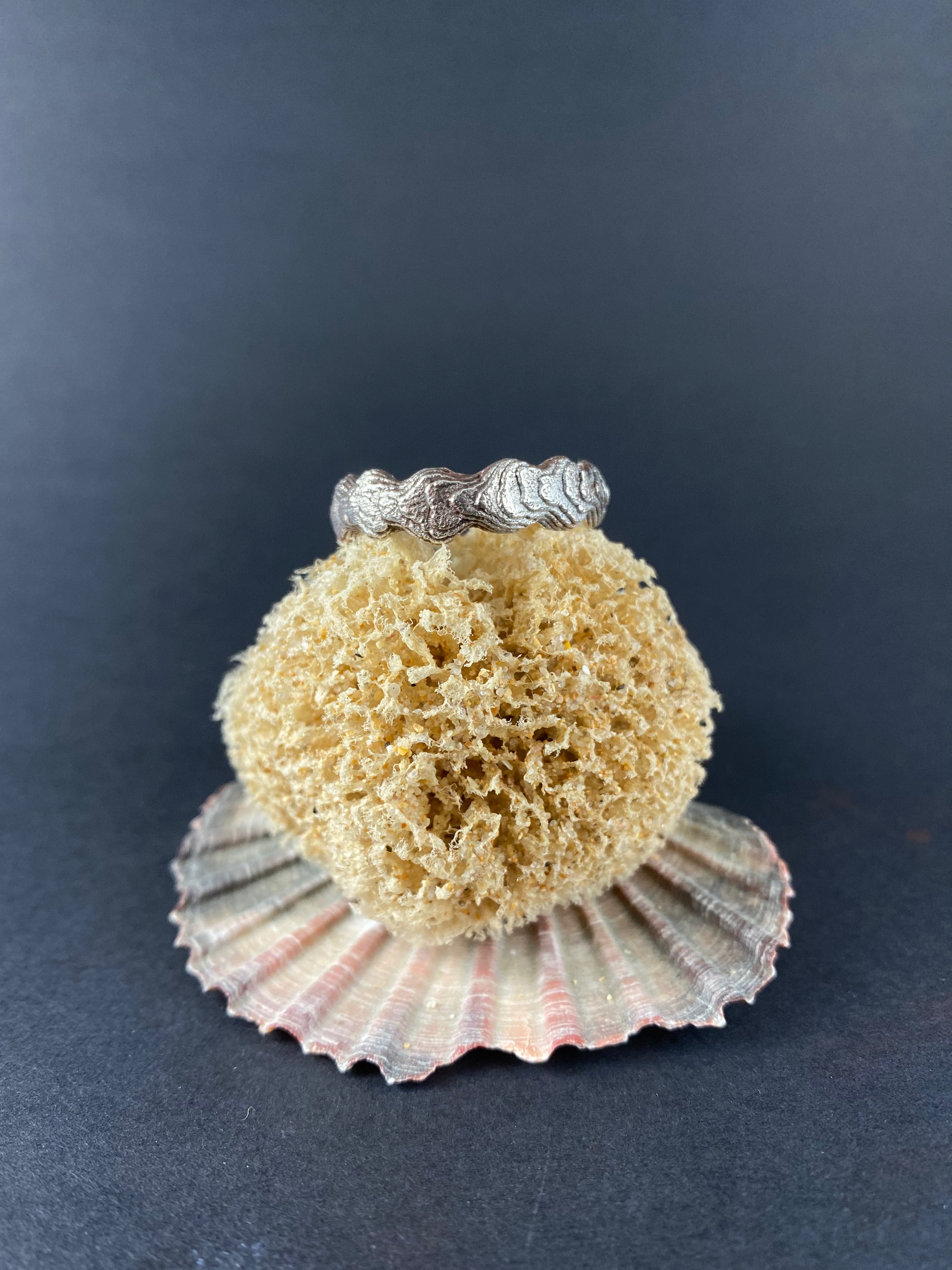 A sterling silver band, cast using cuttlefish bone. As all pieces are cast in cuttlefish, the natural pattern of the cuttlefish will lead to unique variations between pieces, meaning the ring you receive will not have the identical pattern to the displayed image.