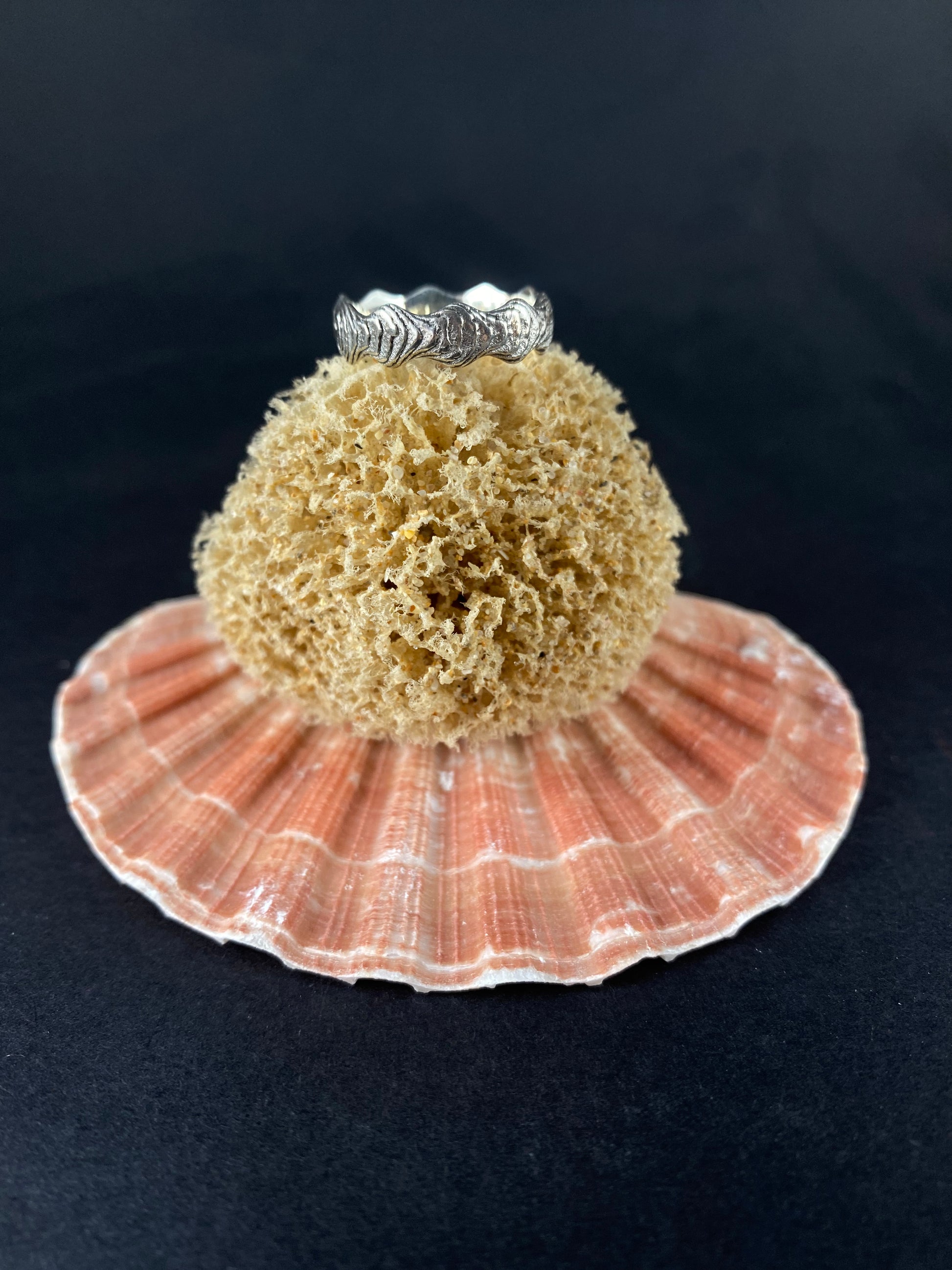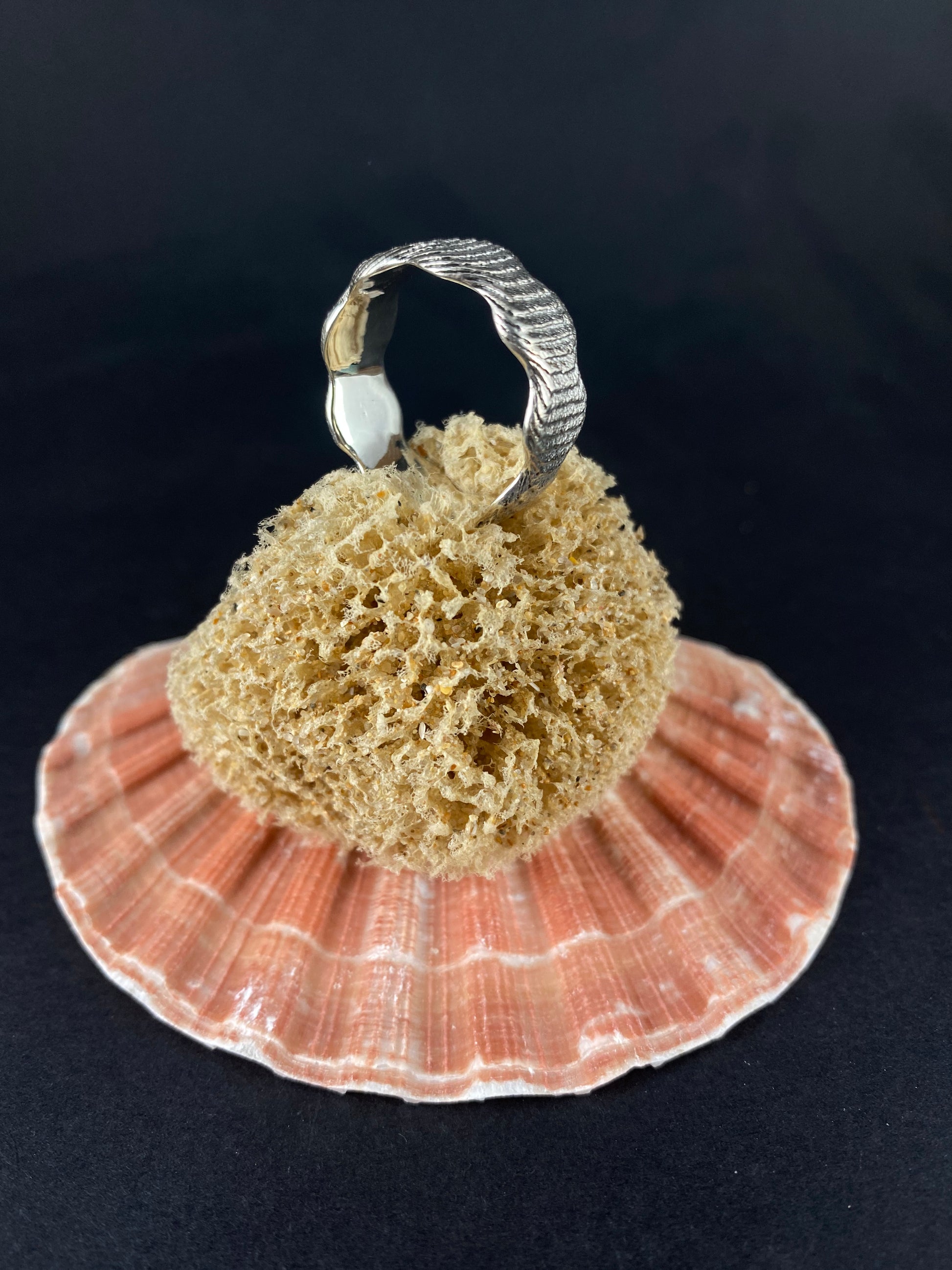 The cloud sterling silver band, cast using cuttlefish bone. This inner surface is polished while the outer surface has a beautiful texture. As all pieces are cast in cuttlefish, the natural pattern of the cuttlefish will lead to unique variations between pieces, meaning the ring you receive will not have the identical pattern to the displayed image.