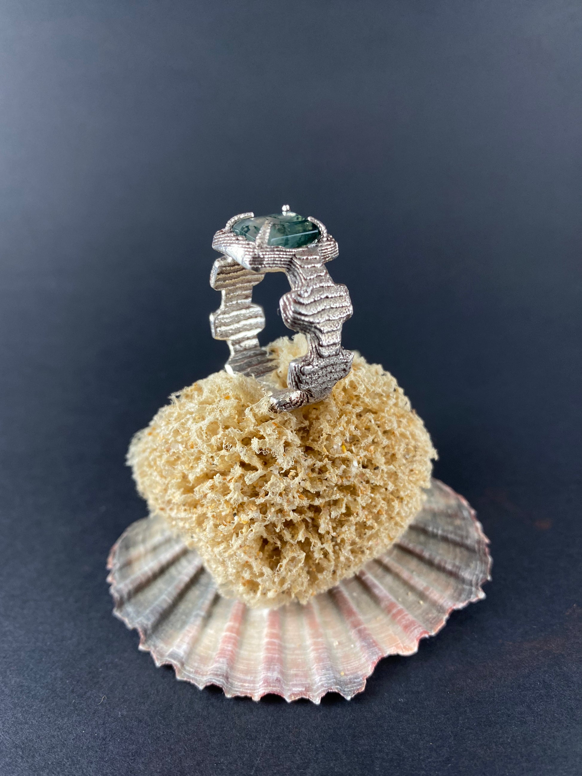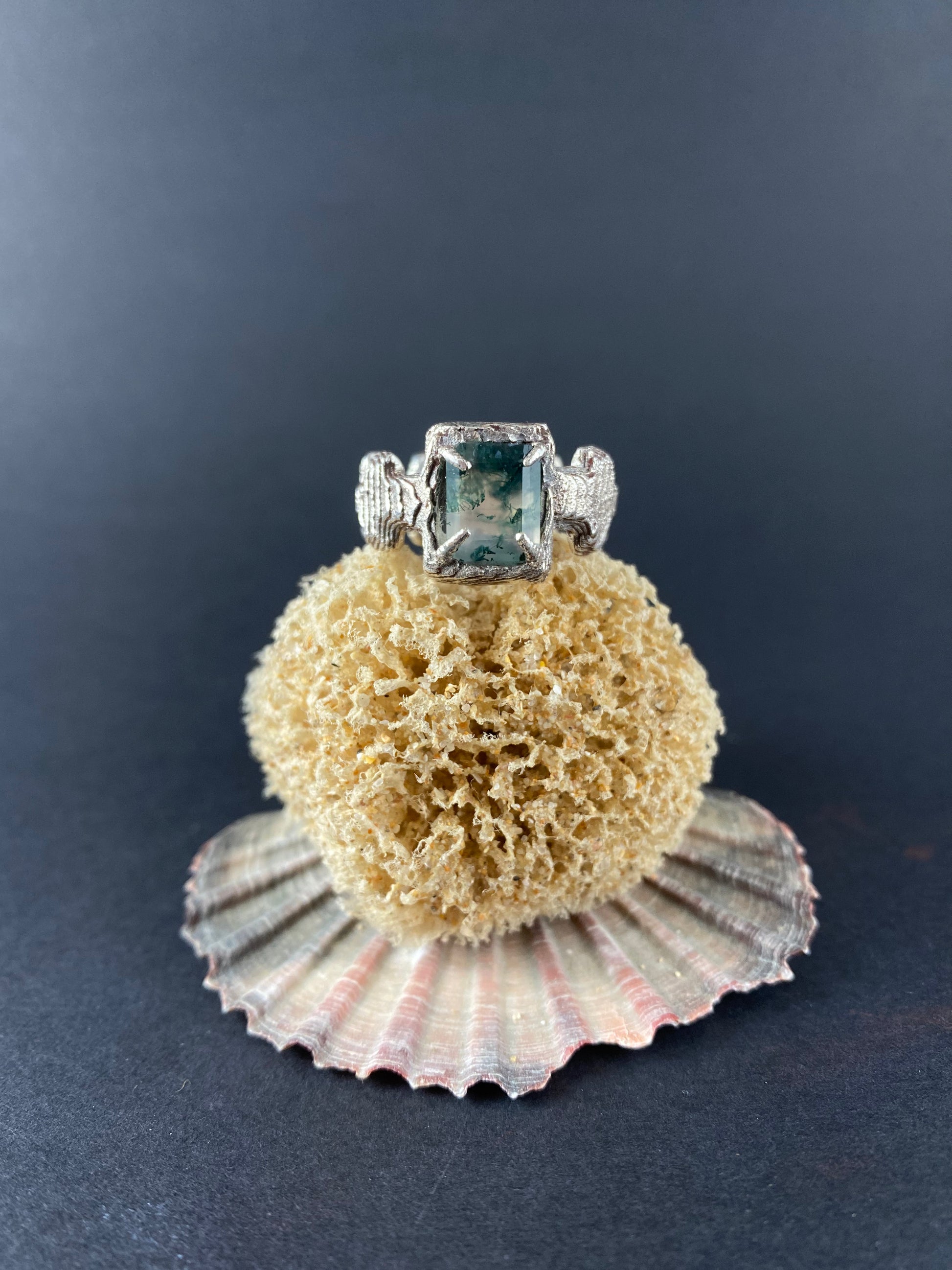 A sterling silver band set using a Tasmanian moss agate, cast using cuttlefish bone. This is a one-off piece, and will not be remade. Size US 9.5.