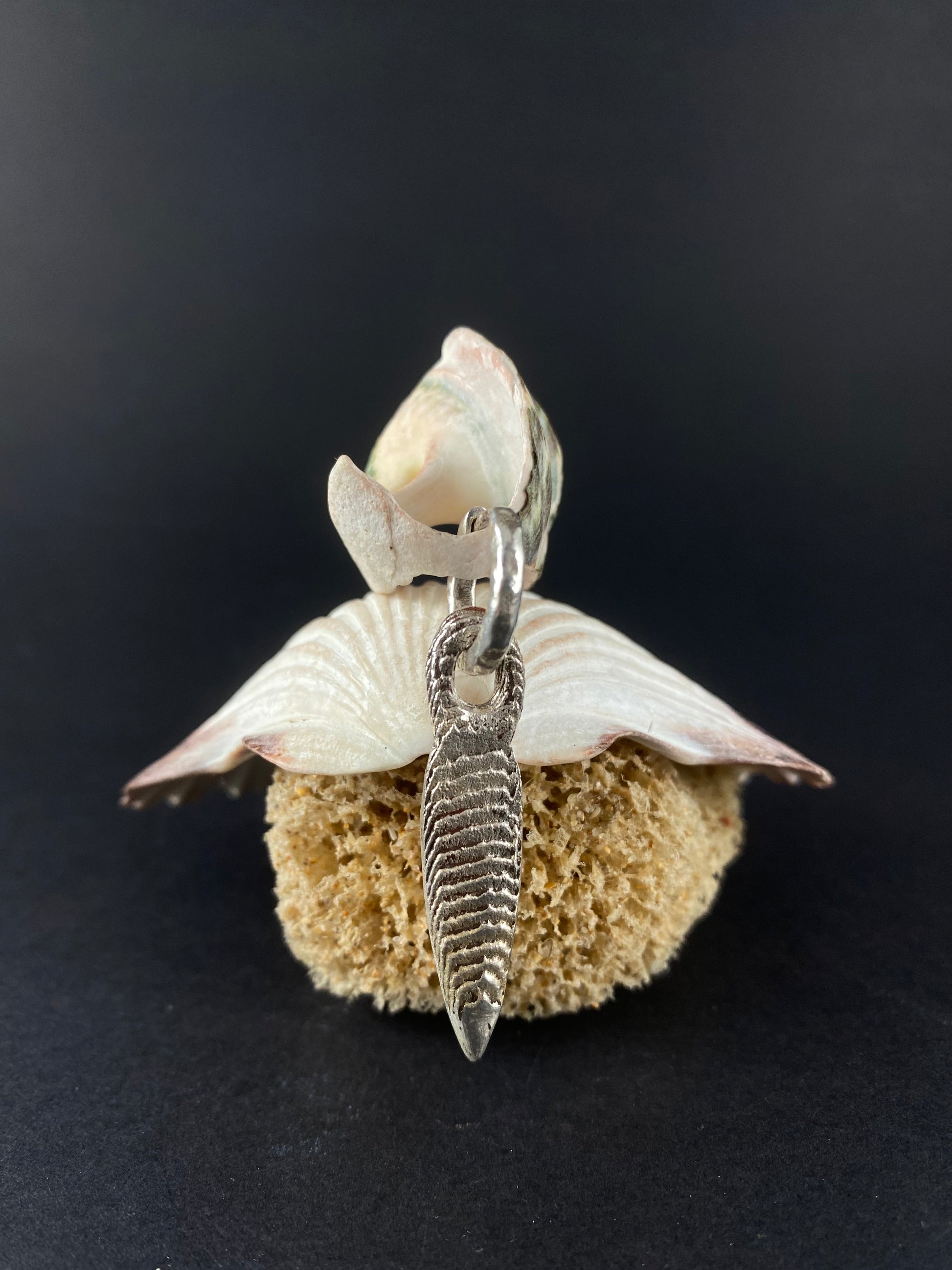 A sterling silver charm, cast using cuttlefish bone. As all pieces are cast in cuttlefish, the natural pattern of the cuttlefish will lead to unique variations between pieces, meaning the earrings you receive will not have the identical pattern to the displayed image.